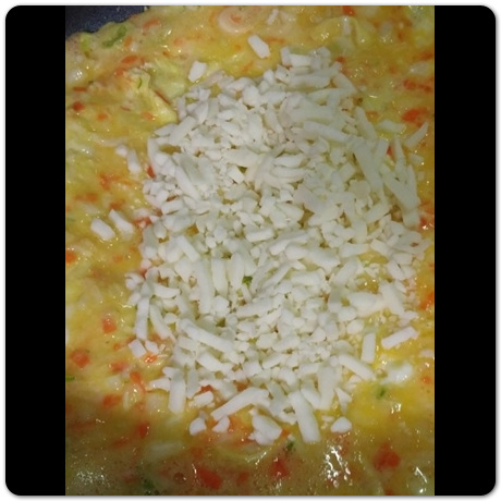 집에 치즈가 있다면 제일 한 가운데에 치즈를 올려주도록 합니다. 모짜렐라 치즈 있다면 한 가운데에 듬뿍 뿌려주면 됩니다. 중요한 점은 여기저기 흩뿌리며 뿌리지 말고 꼭 가운데 위치에 치즈를 뿌려주도록 합니다.