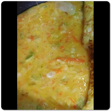 기름 두르고 난 뒤, 후라이팬에 계란물+야채를 최대한 얇게 펼쳐주도록 합니다. 계란말이는 돌돌 말아야 하므로 두껍게 펼쳐지면 잘 말아지지 않습니다. 그래서 최대한 얇게 얇게 펼치면서 후라이팬 안을 전체 채워주면 됩니다.