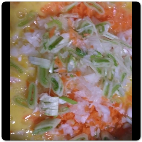 만일 알끈이 있다면 계란 풀기 전에 먼저 제거해주는 게 좋습니다. 소금과 후추 간을 하고난 뒤, 계란을 먼저 최대한 풀고 그 다음에 미리 준비했던 야채들을 전부 볼 안에 넣어주도록 합니다. 볼이 너무 작으면 젓다가 야채가 넘칠수가 있으므로 최대한 넓은 볼을 활용하고 야채도 고루고루 잘 섞일 수 있도록 3~4번 정도 충분히 저어줍니다.