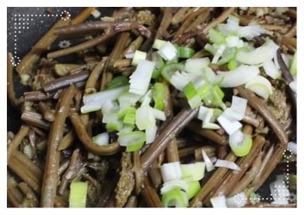 후라이팬에 들기름을 2큰술 정도 두르고 난 뒤 재료들을 전부 넣어주면 됩니다. 다진 마늘 1스푼, 좀 전에 썰었던 파, 찹쌀가루 1큰술, 들깨가루 1큰술, 고사리 전부 한꺼번에 넣어주면 됩니다. 그 다음 종이컵 기준으로 물을 한 컵 정도 넣고 난 뒤 자박자박할 때까지 계속 볶아주면 됩니다.