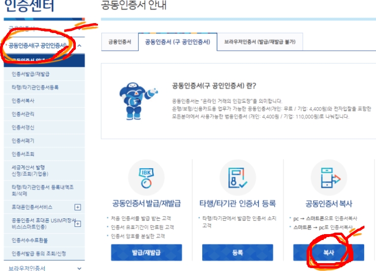 아래의 농협 사이트에 들어가서 왼쪽 메뉴 중 공동인증서 클릭 후 공동인증서 복사를 클릭합니다.
