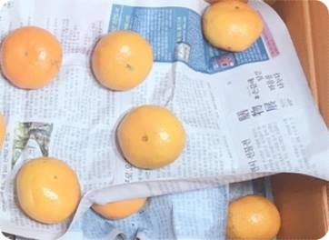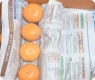 그 뒤 다시 또 신문지를 깔고 제일 끝 부분이 다시 또 귤을 4개정도 놔둡니다. 그리고 신문지 깔고 이런 식의 반복입니다. 상자를 크게 3등분 했다고 치면 1번 자리에 귤 3개->신문 깔기->2번 자리에 귤 3개->신문깔기->3번 자리에 귤 놔두기 등 이렇게 하면 됩니다.