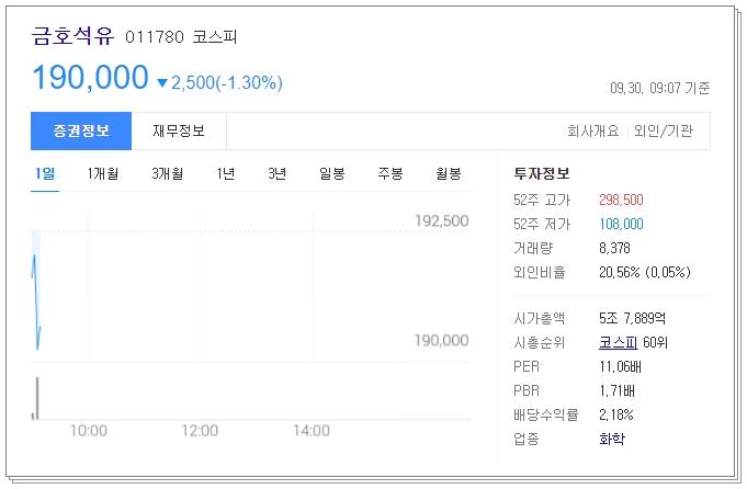 마지막으로 차트 살펴보도록 하겠습니다. 금호석유는 현재 전일 대비 1.30% 하락한 190,000원에 거래되고 있습니다. 52주 고가는 298,500원이었으며 52주 저가는 108,000원이었습니다. 시가총액은 5조 7889억원으로 코스피 60위에 해당합니다.