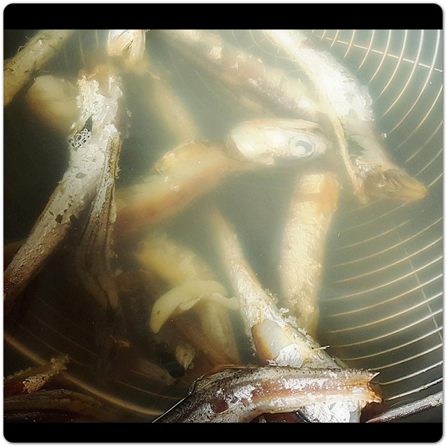 팁) 처음에 5분 정도는 센 불에서 끓여 비린내를 날리고 그 다음 20분 정도는 중불 이하로 낮춰서 은은하게 끓여주면 됩니다. 이렇게 하면 시원하고 깊은 맛을 낼 수 있는 육수를 만들 수 있습니다. 이렇게 20분 정도 은은하게 끓인 뒤, 멸치만 건져내주면 됩니다.