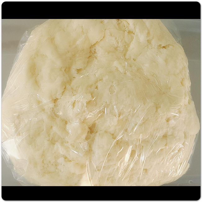 열심히 치댄 뒤 쫄깃한 상태를 만들었다면 더더욱 쫄깃한 식감을 만들기 위해 적당하게 치댄 반죽을 랩에 싸서 냉장고에 1시간가량 넣어 저온 숙성을 시키면 됩니다. 이때는 냉장보관하면 됩니다.