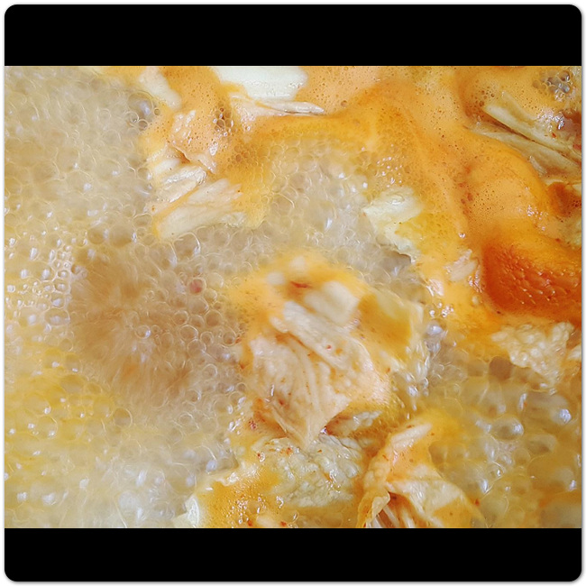 이렇게 김치를 넣고난 뒤, 김치가 어느 정도 익었으면 냉장고에서 숙성시킨 반죽을 얇게 떼내어 툭툭 투하한 다음 3~4분 정도 더 끓여주면 됩니다. 너무 큼직큼직하게 떼내는 것보다 어느정도 먹기 좋은 크기로 툭툭 투하해야 먹을 때도 좋고 보기에도 좋습니다.