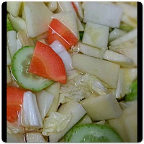 나박김치 맛있게 담그는법 먼저 준비한 재료를 깨끗하게 씻어줍니다. 당근, 오이, 홍고추 등 준비한 재료들을 깨끗하게 씻습니다. 일단 배나 사과를 넣을 때 집에 있는 배가 아삭아삭하지 않다면 갈아서 이 때 씻고난 뒤 갈아주도록 합니다. 무와 배추는 씻고난 뒤 나박썰기를 합니다.