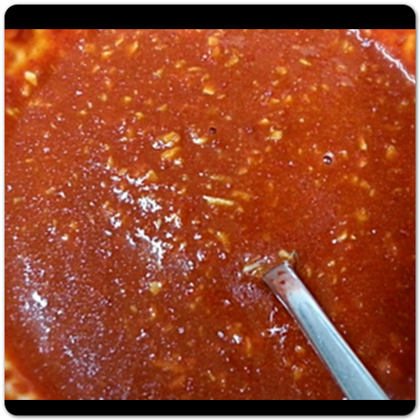 이렇게 준비한 양념장을 그대로 물에 부어주는 게 아니라 체 위에 올린 뒤 고춧가루 물 색만 나오게끔 하는 게 나박김치의 특징입니다. 준비한 양념장을 체에 올리고 숟가락으로 잘 저어주면서 고추 색깔이 빠져나오게끔 합니다. 만일 집에 면보가 있다면 면보에 넣어서 쭉 짜도 괜찮습니다. 만일 체에 걸러서 한다면 망이 촘촘한 걸로 해주시기 바랍니다.