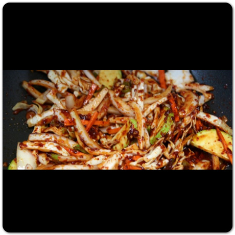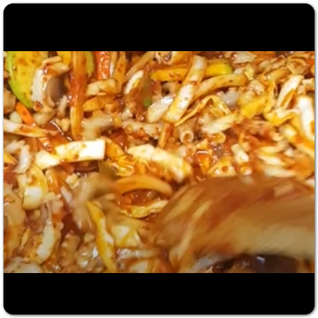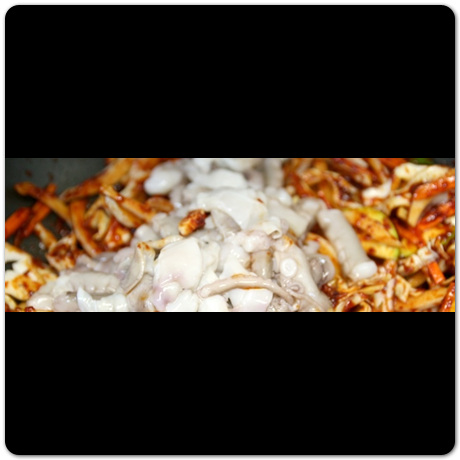 이렇게 중불에서 볶아주다가 양념장이 부글부글 끓기 시작하면 준비했던 야채들을 전부 넣어주도록 합니다. 그리고 양념장과 함께 볶아줍니다. 이렇게 볶아주면 양념장에 야채 수분이 저절로 나오므로 따로 물은 넣어줄 필요가 없습니다. 가장 늦게 익는 양배추와 호박이 익기 시작하면 그 때 손질했던 낙지를 넣어주면 됩니다.