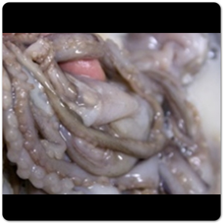 낙지를 1차로 깨끗하게 씻었다면 이제 낙지를 손질해줄 차례입니다. 낙지의 눈과 내장, 먹물이 나오는 부분은 제거해주면 됩니다. 이렇게 제거해준 다음에 낙지를 먹지 좋은 한 입 크기로 잘 잘라주면 됩니다.