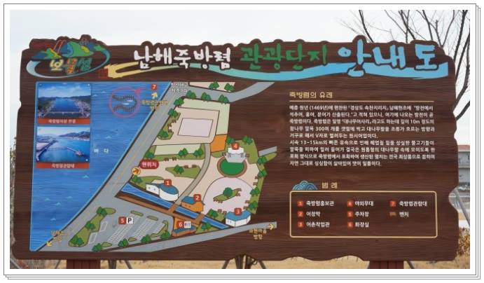 일곱번째 추천 장소는 죽방렴입니다. 위치는 경상남도 남해군 삼동면 지족리에 위치하고 있습니다. 이곳에 가면 멸치 잡는 옛날식 죽방이 설치되어 있는 걸 볼 수 있습니다. 이곳은 멸치 회가 유명하기 때문에 죽방렴에 가서 바다도 구경하고 난 뒤 가볍게 주변 식당에서 멸치 회 먹고 오시는 걸 추천합니다.