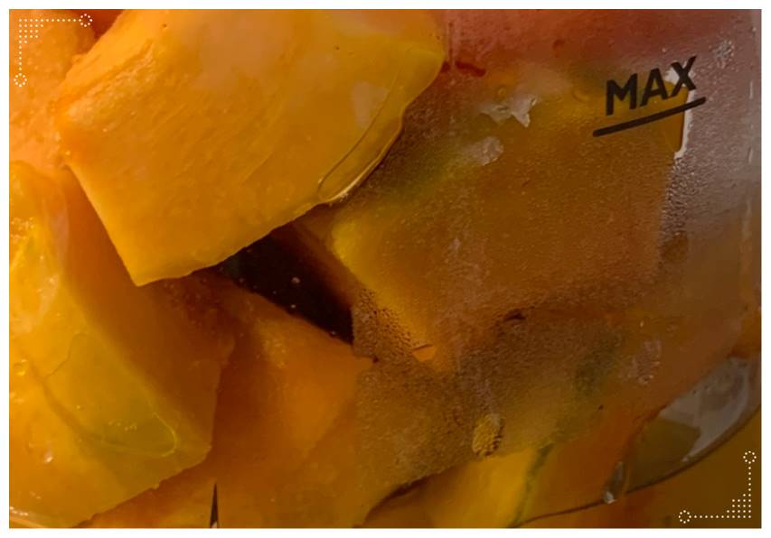 좀 전에 잘랐던 단호박을 우유와 함께 넣은 후 믹서기에서 갈아줍니다. 충분히 갈아주시기 바랍니다.
