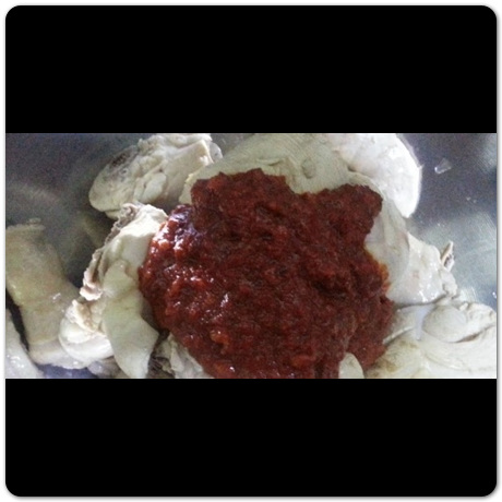 닭볶음탕 황금레시피 이제 양념장을 만들어서 방금 건져낸 닭에 잘 비벼주면 됩니다. 양념장 비율은 고춧가루 3스푼, 간장 2스푼, 마늘, 물 200ml, 매실액기스 3스푼, 참기름 조금, 고추장 1/2스푼, 소금 조금입니다. 만일 단맛을 좋아한다면 설탕도 1스푼 정도 넣어주면 됩니다.