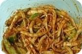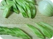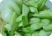 도라지를 절이고 있을 때 우리는 야채를 준비하고 있습니다. 도라지는 오이와도 궁합이 좋습니다. 그래서 오이 도라지무침으로 해먹어도 됩니다. 만일 도라지무침만 한다면 오이는 굳이 손질하지 않아도 됩니다. 야채는 양파와 오이를 준비하고 양파는 채썰고 오이는 어슷설기를 하면 됩니다. 그리고 오이와 양파를 도라지를 절이고 있었던 볼에 함께 담아두면 됩니다.