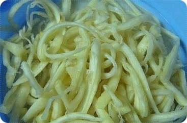 그래서 이런 아린맛을 없애기 위해서는 굵은 천일염 1/2큰스푼을 넣고 도라지를 바락바락주물러 주면서 씻어야합니다. 천일염으로 주물러주면서 없애야만 무침 해먹었을 때 씁쓸한 맛이 나지 않습니다. 여기까지 하고 난 뒤 도라지를 헹군 후 찬물에 담가주도록 합니다. 20~30분 정도 담궈줘야만 쓴맛이 제대로 빠지니 이 세척 과정을 제대로 해주시기 바랍니다. 30분이 지난 뒤 체반에 받쳐서 물기를 제거해주면 됩니다.