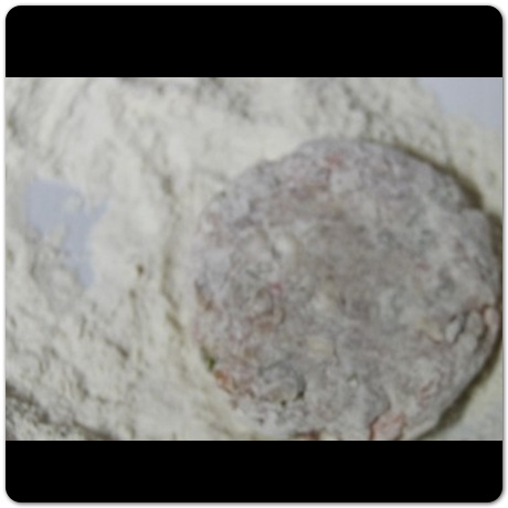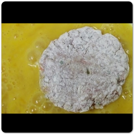 동그란 모양을 잘 만들었다면 이제 계란물과 부침가루(밀가루)를 준비합니다. 먼저 부침가루에 동그랑땡 반죽을 앞뒤로 고루고루 부침가루를 묻힌 뒤 계란물을 입혀주면 됩니다. 이런 식으로 먹을 것들을 골고루 계란물 입혀줍니다.