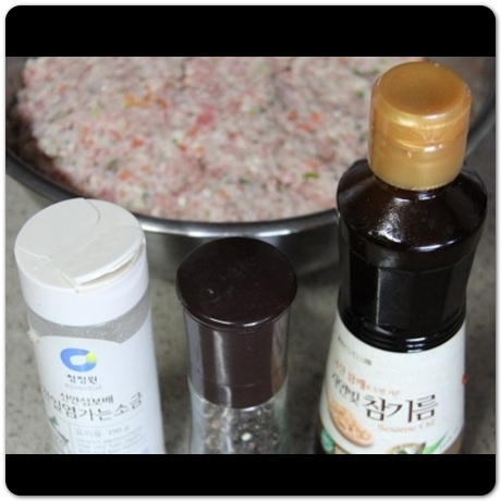 야채, 두부, 다짐육을 큰 대야에 함께 넣었다면 이제 소금, 후추를 넣어주도록 합니다. 그리고 팁을 드리자면, 이렇게 소금과 후추를 넣고난 다음에 참기름도 1~2큰술 넣어주도록 합니다. 이렇게 하면 반죽할 때부터 좀 더 고소한 맛을 낼 수 있습니다.