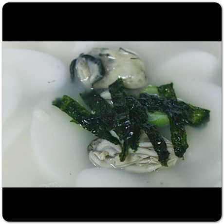 떡국 맛있게 끓이는 법 떡을 계속 끓이고 있으면 어느 순간 떡이 떠오를 때가 있습니다. 그럼 그때 이제 준비했던 굴을 넣어주도록 합니다. 글을 넣고난 뒤, 송송 잘 썰어둔 파도 넣어주도록 합니다.