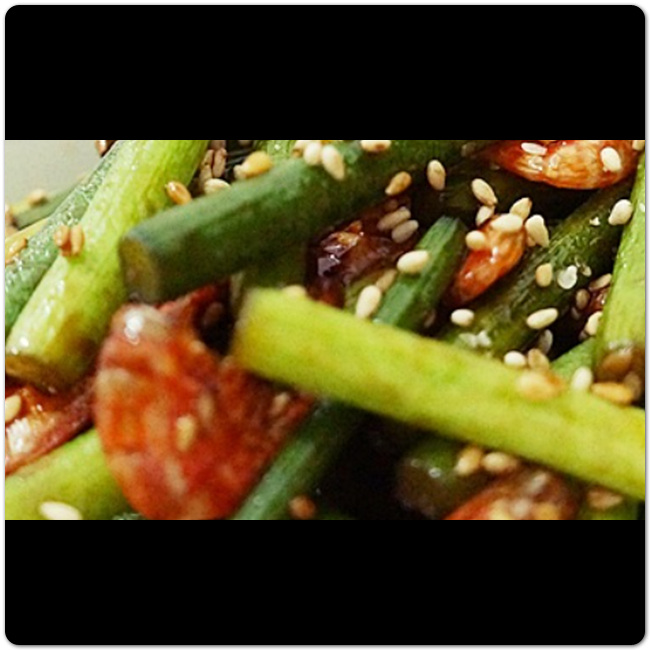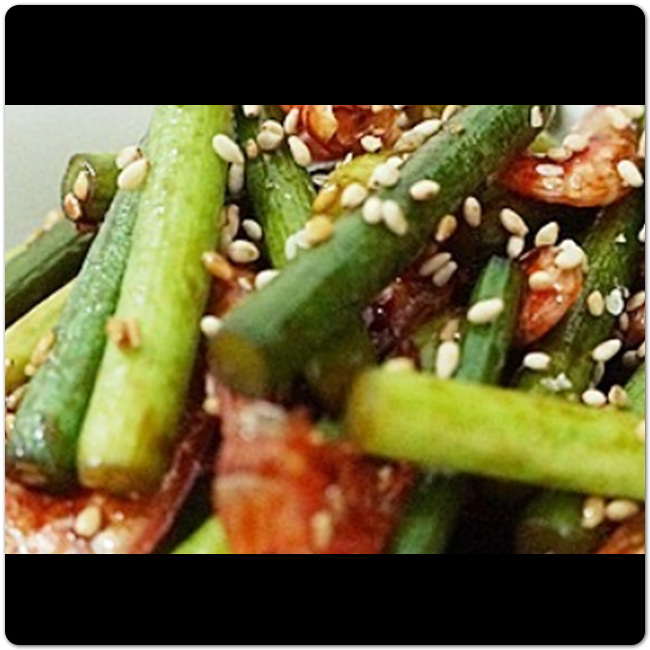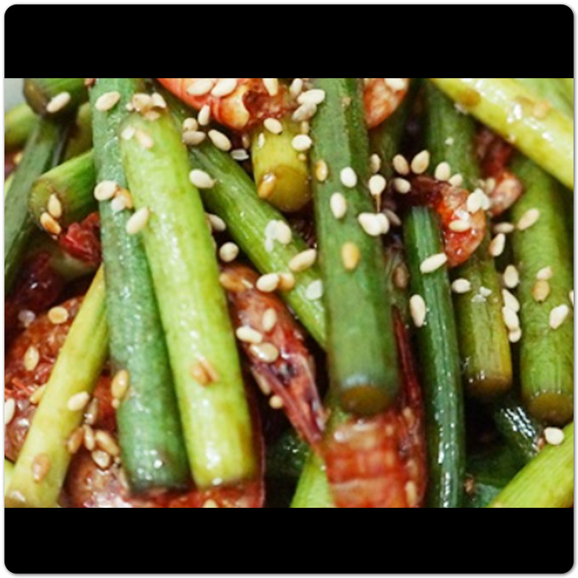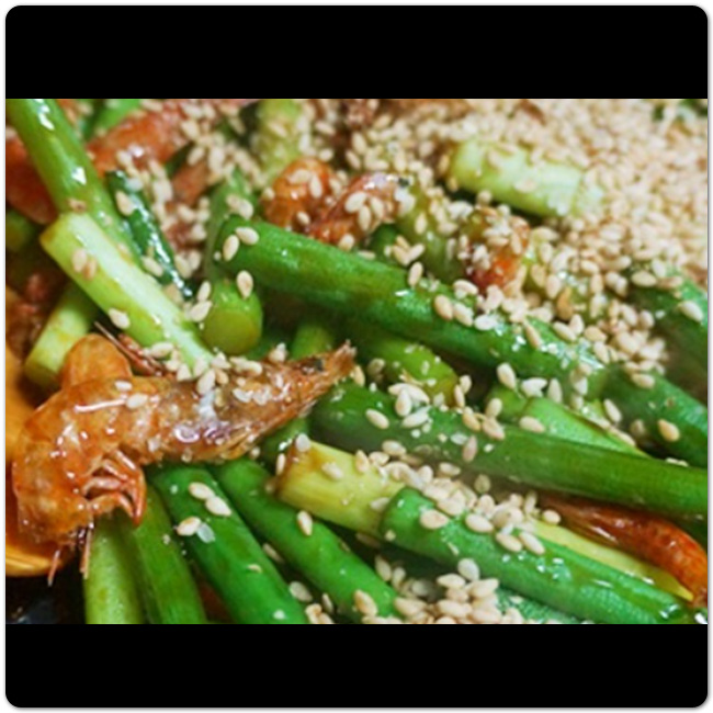 만일 부드러운 식감을 좋아하면 중약불에서 조금 오래 볶고, 아삭아삭한 볶음을 좋아한다면 양념이 끓기 시작할 때 그때 새우 넣고 볶은뒤 바로 불 끄면 됩니다. 이렇게 조리한 뒤, 마지막에 통깨를 뿌려서 마무리해주면 됩니다. 이상 마늘쫑 조리법이었습니다.
