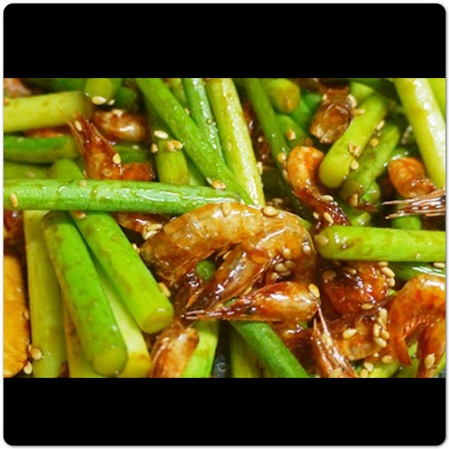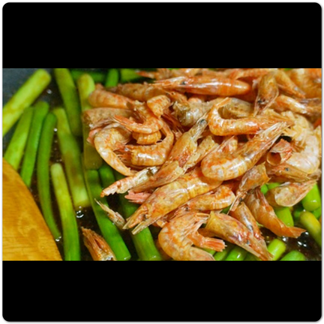 마늘쫑에 양념이 고루고루 잘 베었다면 이제 건새우를 넣도록 합니다. 처음부터 마늘쫑과 건새우를 함께 넣으면, 건새우가 간장 소스를 전부 흡수해서 건새우만 짜고 마늘쫑은 양념맛이 전혀 나지 않습니다. 그러니 마늘쫑에 충분히 양념이 베었다면 그때 건새우를 넣도록 합니다.