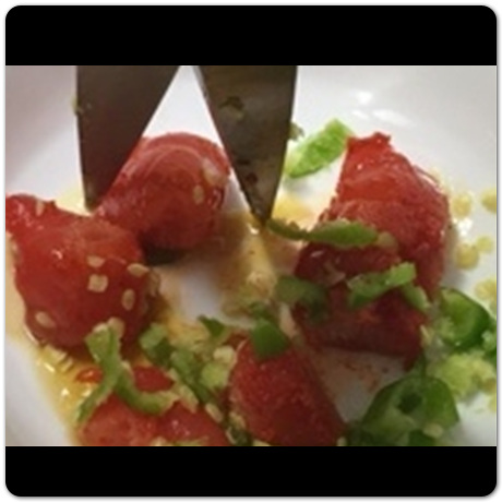 명란젓에 잘게잘게 썰어놓은 고추를 넣었다면 이제 이 위에 참기름을 둘러주도록 합니다. 이 단계까지 다 됐다면 이제 명란젓 또한 청양고추 썰었던 것처럼 좀 더 잘게잘게 가위로 잘라주면 됩니다.