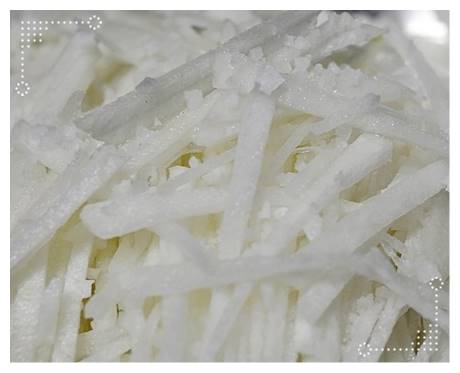 무생채 맛있게 하는법 소금에 절여두면 나중에 양념에 비볐을 때 훨씬 짭조름한 맛이 나옵니다. 채썬 무에 굵은 소금을 뿌려서 대략 10~15분 정도 절여주도록 합니다. 팁 만일에 집에 무청도 있다면 무청도 먹기 좋은 크기로 잘라서 함께 절여주면 좋습니다. 무와 무청 함께 넣어서 버무려주는 것도 무생채 맛있게 하는법 중 하나입니다.