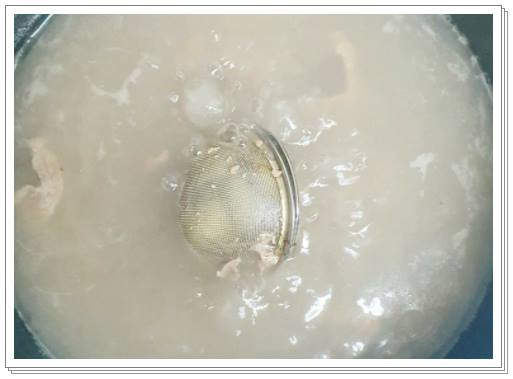 거품도 제법 없어지고, 소고기도 어느정도 익었다면 이제 망을 활용해서 마늘 5개를 넣은 뒤 함께 넣어줍니다. 통마늘을 그대로 넣고 끓이다보면 미역국 먹을 때 마늘이 흩어져서 마늘을 함께 먹게 되므로 이왕이면 좀 더 깔끔하게 먹을 수 있도록 망을 활용해서 마늘을 담은 뒤 방금 우려낸 고기 육수에 잘 넣어주도록 합니다.