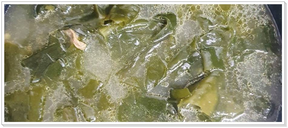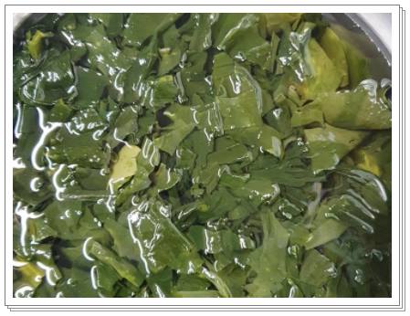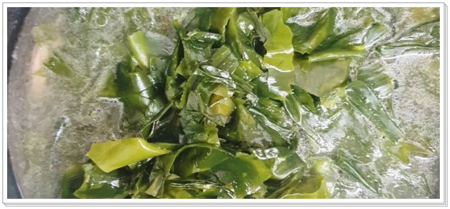미역국 맛있게 끓이는 방법 마늘망을 활용해서 육수를 우려내주고 있을때면 미역도 어느정도 많이 불어있는 상태입니다. 미역을 흐르는 물에 문지르면서 깨끗하게 씻은 뒤 가위로 먹기 좋은 크기로 잘라주도록 합니다. 자르지 않고 그대로 끓여버리면 미역국 먹으면서 다시 또 가위로 잘라야 하므로 육수에 넣기 전 바로 자르는 작업을 진행하도록 합니다. 그 뒤 체반에 받쳐서 물기를 제거하도록 합니다.