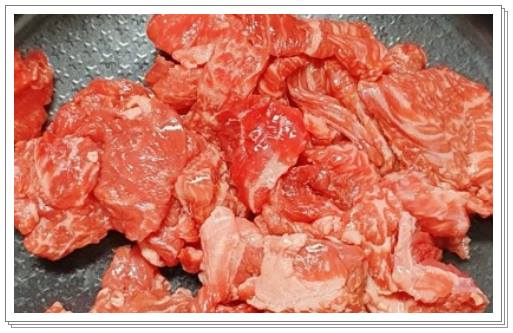 되도록이면 소고기도 이제 막 사온 국거리용 소고기가 제일 맛있습니다. 귀찮긴해도 그때그때 소량씩만 정육점에서 사서 해먹으면 좀 더 부드럽기 때문에 항상 필요한 양만큼만 사와서 조리하도록 합니다. 집 냉동실에 국거리용 소고기가 있다면 미리 전날 냉장고에 넣어놓은 뒤 조리하기 2시간 전부터 상온에 노출시켜 두면 됩니다. 충분히 해동됐으면 냄비에 담도록 합니다.