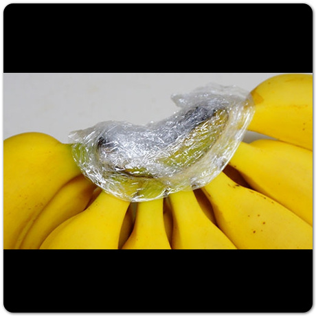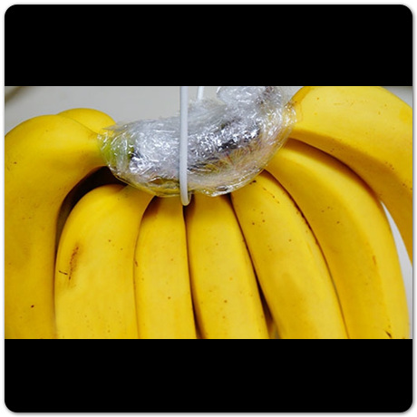바나나 보관법 세 번째 방법은 랩을 활용한 방법입니다. 집에서 쉽게 구할 수 있는 재료가 바로 랩입니다. 이런 랩을 활용해서 바나나 꼭지 부분에 돌돌돌 잘 말아서 씌어주면 끝입니다. 꼭지 부분을 랩으로 감싸주는 이유는 앞에서 언급한것처럼 꼭지 내부로 공기가 들어가는 것을 철저하게 막아주기 위함입니다. 꼭지가 안보일 때까지 제대로 감싸주면 확실히 그대로 놔둔 것보다 4~5일 정도 더 싱싱하게 유지될 수 있습니다.