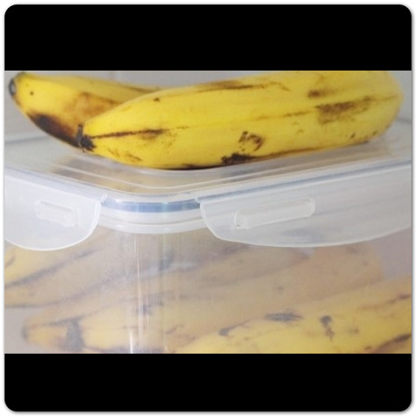 두 번째 방법은 락앤락 통에 보관하는 방법입니다. 일단, 과일은 꼭지를 떼면 내부로 공기가 들어가면서 익게 됩니다. 바나나 또한, 꼭지가 조금씩 열리면서 그 속에 공기가 들어가서 검은 색으로 변하게 됩니다. 이런 바나나를 락앤락 통에 넣어두면 외부와의 공기 마찰을 줄일 수 있습니다. 굳이 호일에 감싸거나 비닐에 보관할 필요 없이 락앤락 통에 넣어두는 순간 공기를 차단해서 좀 더 싱싱하게 노란색으로 보관할 수 있습니다.