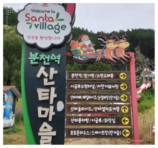 이곳에 가면 이정표가 보이면서 자유롭게 관람이 가능하며 천천히 이동하며 관람한다면 소요시간은 대략 1~2시간 정도 걸릴 것으로 예상됩니다. 특히, 포토존이 걷는 내내 있으므로 평소 사진 찍는 걸 좋아한느 분들은 이곳 산타마을에서 예쁜 추억 많이 남기고 오시기 바랍니다.