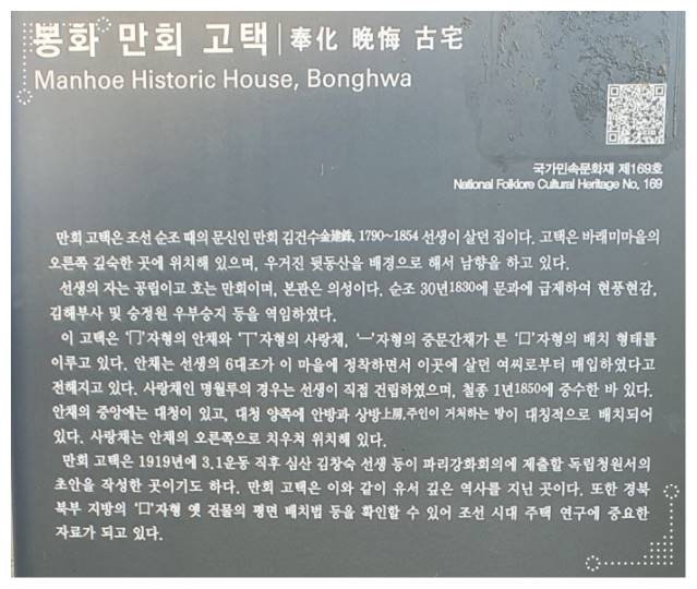 이 봉화 만회 고택은 조선 순조 때 문신이었던 김건수 선생이 살던 집으로 알려져 있습니다. 김건수 선생의 자가 공립이며 호가 만회이므로 봉화 만회 고택이라고 지칭되었습니다. 우리의 옛 스런 한옥 미를 느낄 수 있는 곳이므로 여기도 다녀가보시기 바랍니다.
