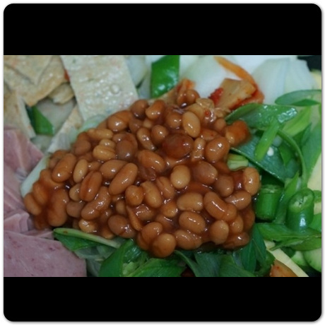 그리고 부대찌개 콩으로 불리우는 베이크드빈스를 준비합니다. 그 다음, 햄과 오뎅, 호박, 고추, 깻잎, 대파의 흰 부분을 손질해주면 됩니다. 이 외 냉장고를 열어서 집에 있는 각종 채소를 같이 넣어줘도 됩니다. 애호박이다 당근 등도 괜찮습니다.