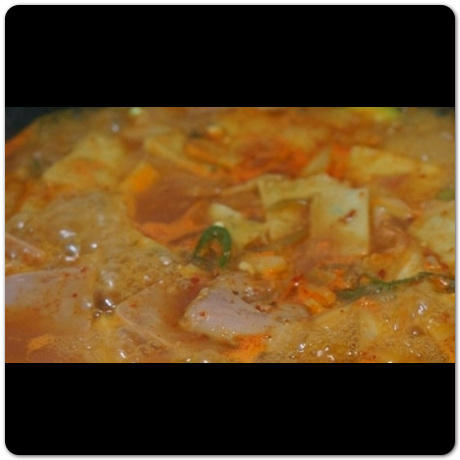 물을 부었다면 이제 뚜껑을 닫고 푹 끓여주도록 합니다. 부글부글 끓기 시작하면 간을 보고, 싱겁게 느껴지면 좀 전에 남겼던 양념장을 조금씩 넣어주면서 간을 맞추면 됩니다. 그리고 가장 제일 마지막에 라면 사리와 대파를 넣어주면 됩니다. 라면사리는 일찍 넣으면 끓는 동안 면이 다 끓어버리므로 가장 나중에 넣어주도록 합니다.