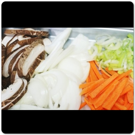 양념에 고기를 재워뒀다면 이제 부재료를 준비하도록 합니다. 불고기에 들어갈 부재료는 양파 반개, 당근 약간, 그리고 표고버섯은 2개 정도 밑동 떼서 채 썰어두면 됩니다. 집에 표고버섯 없으면 생략해도 됩니다. 그 다음 대파도 잘게 썰어서 준비하면 됩니다.