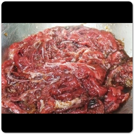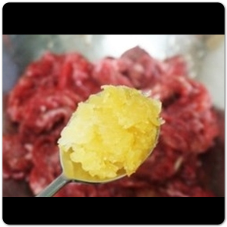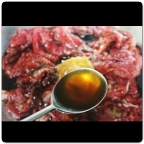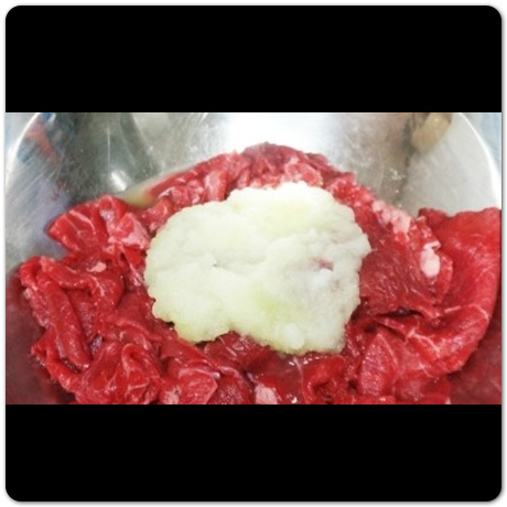 불고기 양념 황금레시피 설탕과 물엿에 밑간을 잘 해둔 뒤 20분이 지났다면 양파 반 개 정도를 강판에 갈아줍니다. 그리고 갈아준 양파를 밑간해뒀던 고기 위에 뿌려줍니다. 그 다음 좀 전에 밑간할 때 조물조물 해줬던 것과 마찬가지로 이번에도 고기에 조물조물 양파가 고루고루 들어갈 수 있게 버무려줍니다. 어떤 고기이든 이런 식으로 양파를 갈아서 밑간을 해두면 고기를 먹을 때 훨씬 부드럽게 먹을 수 있습니다.