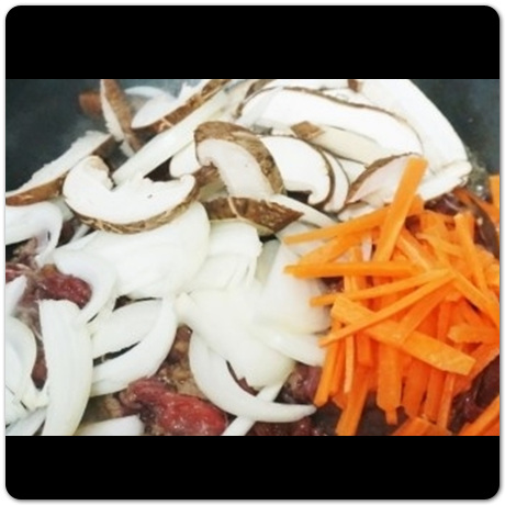 부재료까지 준비되고 양념 넣은 고기도 대략 10분 정도 지났다면 이제 팬을 예열해서 양념에 재워둔 불고기를 올려줍니다. 일단 부재료에서 대파도 함께 넣어버리면 흐물흐물 해지기 때문에 대파를 제외한 나머지 부재료만 같이 넣어주도록 합니다. 함께 넣어서 볶아주면 됩니다.