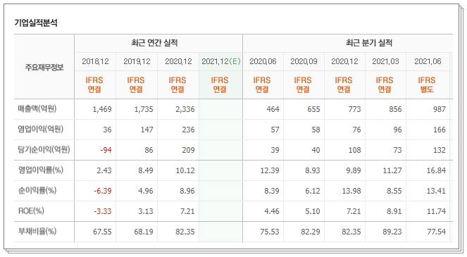 순이익률로 보자면 올해의 영업이익은 10.12% 정도 상승한 셈입니다. 당기 순이익은 2018년은 적자였지만 2019년 흑자 전환해서 2019년은 86억원, 2020년은 209억원입니다. 부채비율 또한 100 아래로 안정적입니다.