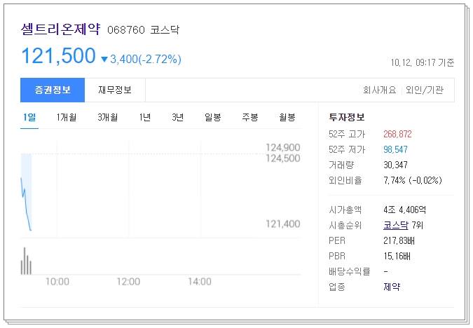 마지막으로 차트 흐름 알아보겠습니다. 현재 전일대비 2.72% 하락한 121,500원에 거래되고 있습니다. 52주 고가는 268,872원이었으며 52주 저가는 98547원이었습니다. 현재 시가총액은 4조 4406억원으로 코스닥 7위에 해당합니다.