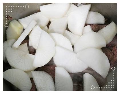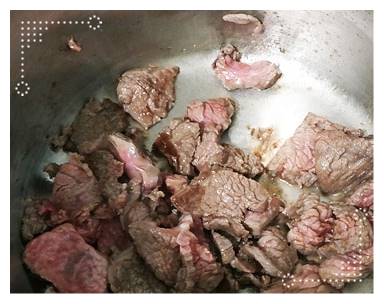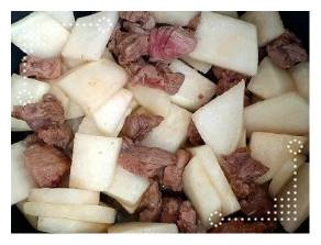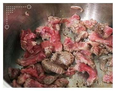 소고기의 핏물이 없어졌다면 냄비에 참기름을 2스푼 정도 둘러준 후 고기를 넣어줍니다. 그리고 중불에 소고기를 볶아줍니다. 참기름의 고소한 냄새와 함께 소고기의 핏기가 사라지면 그 때 미리 썰어뒀던 무를 넣어주도록 합니다.