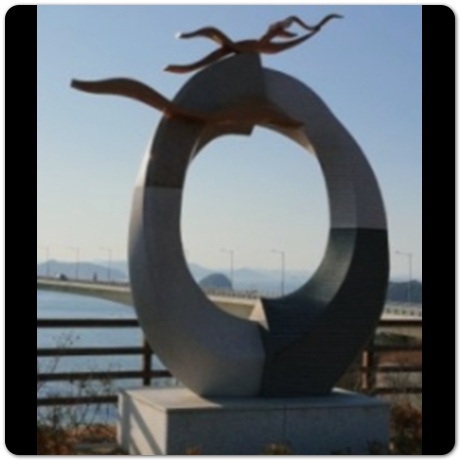 해당 작품명은 비상이라는 작품으로 조형물의 왼쪽, 오른쪽 크기를 보면 좌우 크기가 다름을 알 수 있습니다. 이곳이 바로 포토존이면서 전망대이기도 한 장소입니다. 전망대에 있으면 천사대교 모습이 한 눈에 보이고 그 외 암태도나 팔금도같은 신안 섬들을 바라볼 수 있습니다.