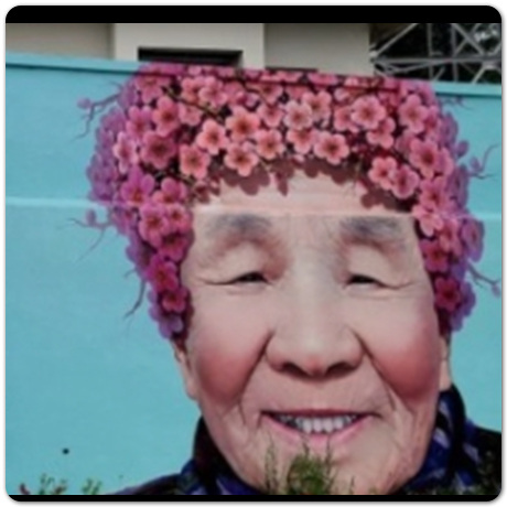 아홉번째 추천 장소는 암태도 벽화마을입니다. 입구에 들어서자마자 동백머리 벽화를 마주할 수 있습니다. 특이하게 벽화에 머리를 그리지 않고, 사람 얼굴만 크게 그린 뒤 머리부분에 해당하는 곳에 동백나무 두 그루가 크게 자리하고 있습니다.
