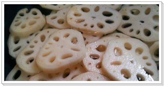 첫 번째 단계는 연근 세척하는 단계입니다. 먼저 연근 껍질의 흙을 털어낸 후, 껍질을 벗기고, 0.5~1cm 의 두께로 썰어주도록 합니다. 다 썰고난 뒤에는 대야에 썰어놓은 대야를 담아놓고 식초를 1~2방울 정도 떨어트린 후 5분 정도 담궈두도록 합니다. 물 넣어두는 양은 연근이 충분히 잠길정도면 됩니다. 이렇게 미리 작업을 하면 불순물도 빠져나갈뿐만 아니라 연근이 갈변하는 것도 방지해줍니다.