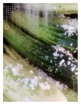 오이를 깨끗하게 세척하고 난 뒤 이제는 굵은 소금이 아닌 고운 소금으로 오이 겉면을 문질러주면 됩니다. 오이 소박이 담글 때 절여두기 위해서 소금을 오이 위에 뿌리는 것보다 그 전 단계에 오이 겉면에 고운 소금을 묻혀놓으면 간이 좀 더 잘되니 이 과정도 꼭 해주시기 바랍니다.