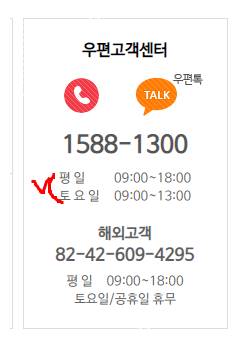 우편고객센터 1588-1300 평 일09:00~18:00 토 요 일09:00~13:00 해외고객 82-42-609-4295 평 일09:00~18:00 토요일/공휴일 휴무