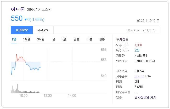 마지막으로 차트 살펴보도록 하겠습니다. 전일대비 현재 1.08% 하락한 550원에 거래되고 있습니다 52주 고가는 1320원이었으며 52주 저가는 226원이었습니다.