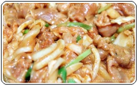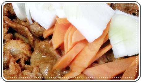 양념장에 함께 버무린 목살과 야채를 넣어줍니다. 야채가 많이 들어갔다면 야채에서 저절로 국물이 나오기 때문에 잘 저어주면 후라이팬 바닥에 들러붙는 경우는 없습니다. 중불에서 골고루 잘 저어주면 야채 육수가 나오면서 제육볶음이 완성됩니다.
