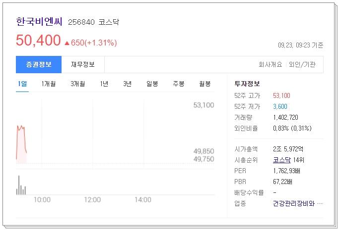 마지막으로 차트 살펴보겠습니다. 현재 전일대비 1.31% 상승한 50,400원에 거래되고 있습니다. 52주 고가는 53100원이었으며, 52주 저가는 3600원이었습니다. 시가총액은 2조 5972억으로 시총순위는 코스닥 14위에 해당합니다.