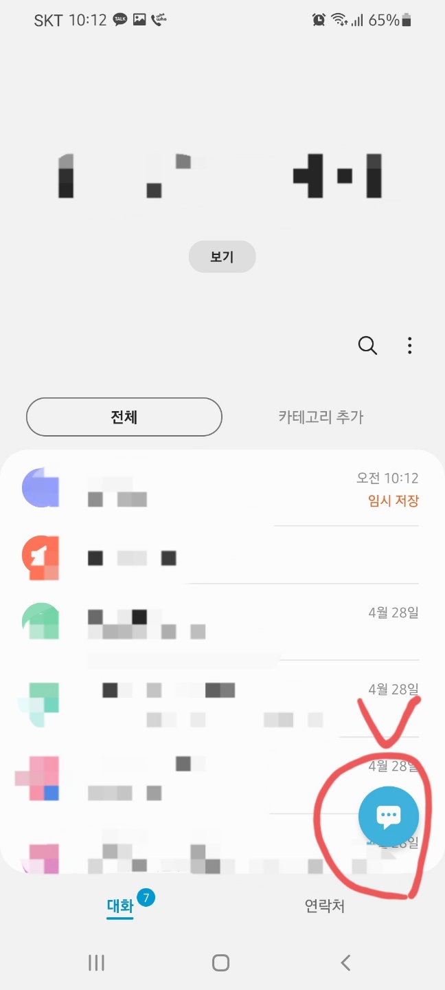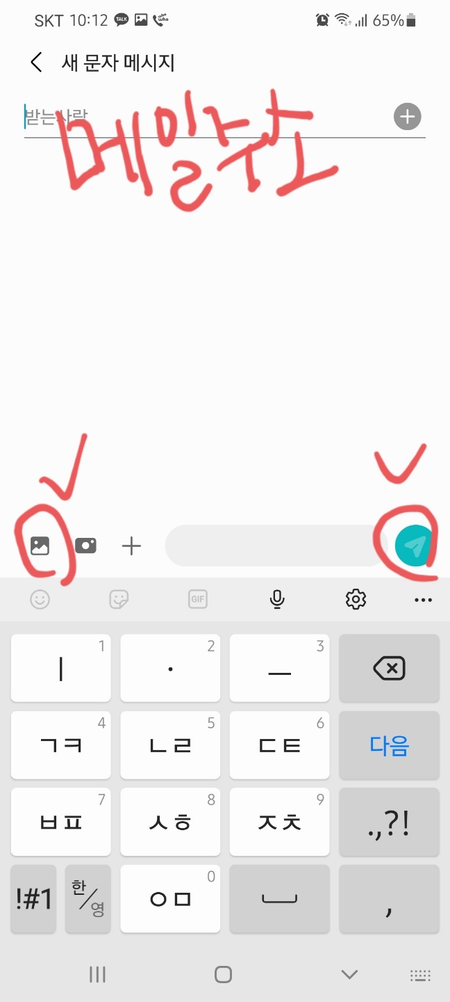 이제 사진 여러장을 한꺼번에 이메일로 보내는 방법을 알려드리도록 하겠습니다. 바로 문자 기능을 활용해서 여러 장을 보내는 방법입니다. 누군가에게 문자 보낼 때 우리가 꼭 핸드폰 번호만 적을 필요 없이 받는 사람에 이메일 주소를 입력해도 됩니다. 먼저 아래 사진처럼 문자 이모티콘을 눌러주시기 바랍니다.